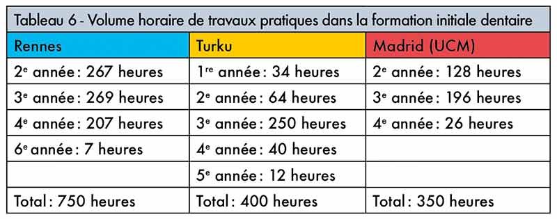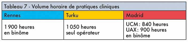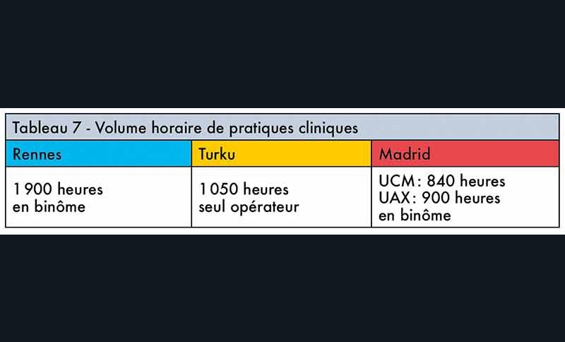 En France, l’exercice clinique débute en 4e année. À Rennes, l’étudiant comptabilise au total 1 900 heures de clinique en binôme, avec 450 heures en 4e année, 800 heures en 5e et 650 heures en 6e. En Finlande, la pratique clinique est répartie sur trois années et totalise 1 050 heures. Quatre à cinq vacations de 4 heures sont réalisées dans la semaine. Rappelons que l’étudiant travaille seul, donc il est toujours opérateur, il fixe lui-même ses rendez-vous et a la possibilité de réserver des créneaux supplémentaires lorsque des sièges sont libres via la plateforme internet.