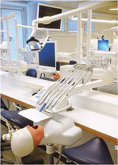 La bouche du patient fictif est remplacée par une mâchoire en plastique dans laquelle seront implantées des dents artificielles (modèles Frasaco, KaVo) ou naturelles. Les étudiants espagnols s’entraînent également sur des simulateurs de réalité virtuelle (Simodont). Au cours de ces heures de travaux pratiques, encadrés par des professeurs référents, l’étudiant manipule les principaux outils et matériaux et met en œuvre les protocoles opératoires. Dans les trois universités citées, des partenariats sont établis avec les industriels pour permettre aux étudiants de découvrir des technologies récentes.