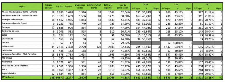 Selon les résultats définitifs publiés par le ministère de la Santé, la FSDL progresse de près de 9 points par rapport aux élections précédentes passant de 30,22 % en 2010 à 39,15 %. La CNSD, quant à elle, perd 13,6 points, passant de 51,16 % en 2010 à 37,56 %. Enfin, l’UJCD progresse de 4,66 points, passant de 18,63 % en 2010 à 23,28 %. Le taux de participation a été de 44,38 % en retrait de 2,06 points. La FSDL devient ainsi la « première organisation professionnelle représentative des chirurgiens-dentistes libéraux conventionnés », souligne le ministère de la Santé.
