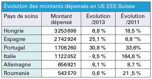 Au palmarès des pays les plus fréquentés par les Français pour les soins dentaires figure le Portugal où 7 959 assurés (5 933 en 2011) se sont fait rembourser les soins qu’ils y ont reçus, l’Espagne avec 4 469 assurés (3 423), la Hongrie avec 2 279 (1 956) puis l’Allemagne et la Belgique. Mais ce classement est bouleversé dès lors que l’on compare le montant des remboursements par assuré. La Hongrie arrive alors largement en tête avec un montant moyen par assuré de 1 428 €, soit plus de 3 millions d’euros au total devant la Roumanie (1 033 €) et l’Italie (917 €).