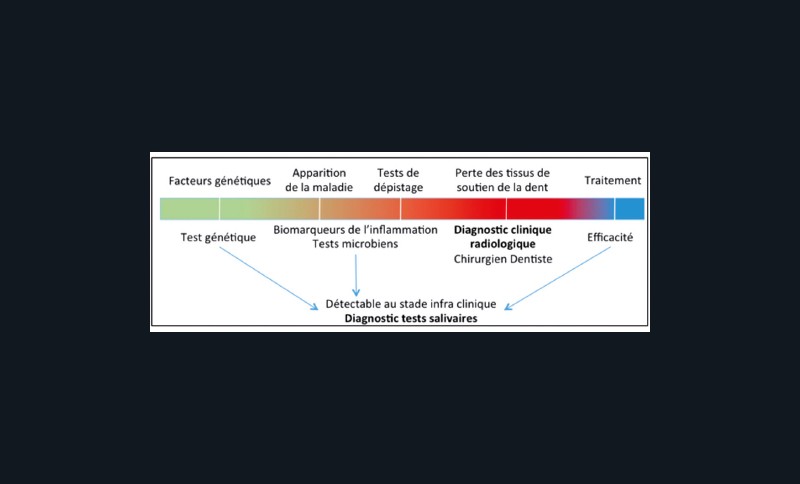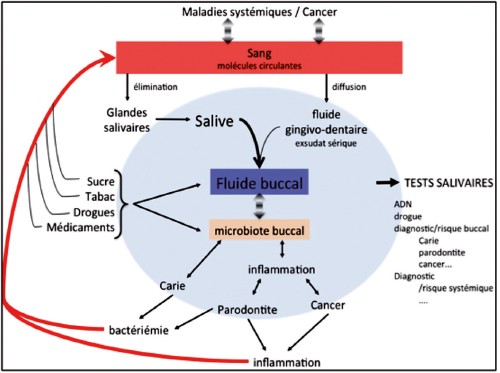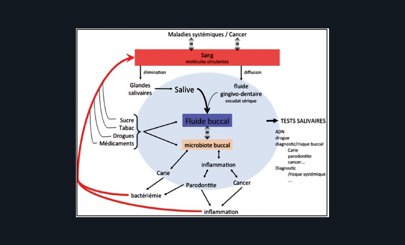 Ces dernières sont le résultat du mode de vie du patient, de son terrain génétique, mais aussi de la composition du fluide buccal modulant la flore microbienne. Certains éléments extérieurs tels que les apports répétés de sucres favoriseront les bactéries acidophiles et aciduriques et finalement l’apparition de caries ; le tabac et l’alcool favoriseront les problèmes parodontaux et les cancers ; et, enfin, une mauvaise hygiène bucco-dentaire aggravera ces pathologies. D’autres éléments perturbateurs peuvent également intervenir tels qu’une baisse de la sécrétion salivaire soit lors du vieillissement, soit dans le cadre de certaines pathologies, ou bien encore lors de la prise de médicaments, engendrant des pathologies dentaires. Le diabète pourra également influencer la santé bucco-dentaire avec des complications parodontales. Des tests salivaires permettent essentiellement de compléter l’examen buccal du chirurgien-dentiste (examens complémentaires). Certains de ces tests existent déjà sur le marché mais ne font souvent que confirmer ce que le chirurgien-dentiste a objectivé visuellement ou radiologiquement. Cependant, les risques carieux, parodontaux et cancéreux au niveau buccal peuvent se révéler plus compliqués à diagnostiquer lorsqu’aucun signe n’est encore visible. Ces tests salivaires ou de fluide buccal permettraient de détecter des patients à risque et ainsi de permettre la mise en place de stratégies de prévention précoces.