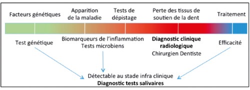 Un exemple simple est la parodontite : le diagnostic précis est souvent considéré comme compliqué à établir et chronophage, nécessitant la réalisation d’un sondage et de radiographies de l’ensemble des dents. Ces examens sont malheureusement souvent réalisés lorsque les atteintes osseuses sont déjà importantes. Ainsi, la standardisation de tests biologiques non dépendants de la technique de l’opérateur et non chronophages pourrait être bénéfique pour le patient et le chirurgien-dentiste. Ceci, aussi bien au niveau de la détection de patients à risque, avant même les premières pertes osseuses, que pour le suivi de l’efficacité du traitement en cours (fig. 2).