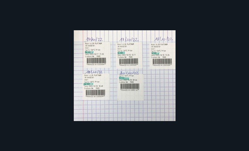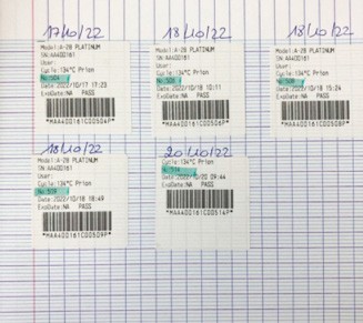 En pratique, l’autoclave enregistre les paramètres complets de chaque cycle de stérilisation et imprime le nombre d’étiquettes demandées avec code-barres. Ces dernières sont à coller sur chaque sachet stérilisé.