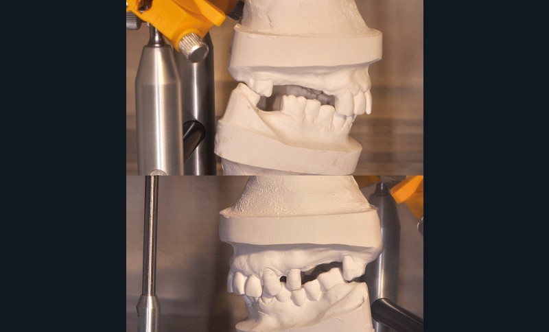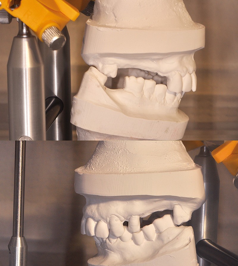 Avant de répondre aux différentes interrogations cliniques, il faut analyser la situation par des évaluations cliniques (état coronaire, situation endodontique, environnement parodontal) (fig. 1) puis, parfois, il est nécessaire de poursuivre cette étude préthérapeutique à l’aide d’outil de simulation comme l’articulateur (fig. 2), de techniques radiologiques en 3D. La conjugaison du recueil des informations et de l’analyse de la situation va nous permettre de proposer une solution en rapport avec la problématique médicale globale.