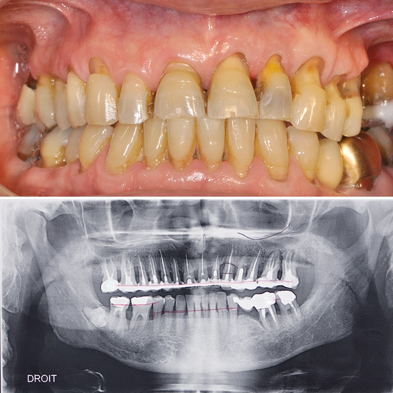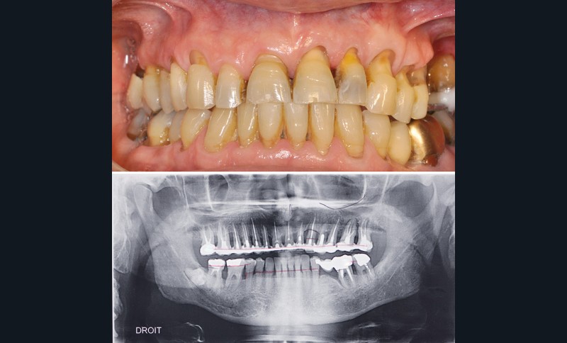 Ainsi, chez ce patient (fig. 3) quelle(s) solution(s) thérapeutique(s) peut-on envisager pour répondre au problème de mobilité dentaire en respectant son souhait de conservation ? Doit-on envisager d’extraire toutes les dents et d’avoir recours à une solution implantaire ou existe-t-il une solution fiable de conserver ses dents ?