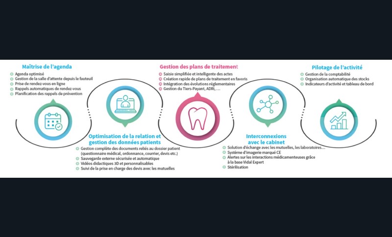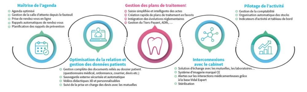 D’autres fonctionnalités concernant la gestion de l’agenda (rappel de rendez-vous automatique, prise de rendez-vous en ligne…), la digitalisation de la relation patient (dossier patient numérique, supports didactiques pour faciliter la compréhension des traitements, suivi de prises en charge et des devis…), ou encore le pilotage du cabinet (comptabilité, stocks, stérilisation, indicateurs d’activité…), sont les clés de l’optimisation et de la performance de votre cabinet dentaire.