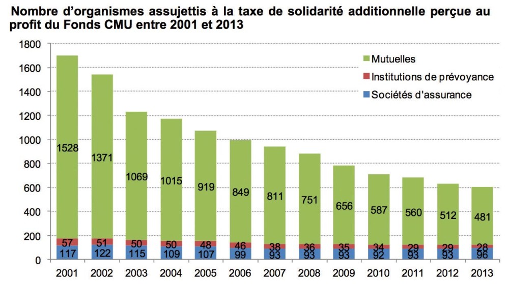 33 milliards d’euros de cotisations ont été collectés en France en 2013 par l’ensemble des 605 organismes pratiquant une activité de complémentaire santé (481 mutuelles, 96 sociétés d’assurance et 28 institutions de prévoyance), relève la Direction de la recherche, des études, de l’évaluation et des statistiques (DREES) dans son rapport 2014 sur « La situation financière des organismes complémentaires assurant une couverture santé » publié le 12 mai (www.drees.gouv.fr). « Depuis 2001, le nombre d’organismes présents sur le marché français de la complémentaire santé a reculé de 64 % », souligne la DREES. Le nombre de mutuelles a été divisé par trois depuis cette date et le nombre d’institutions de prévoyance par deux.