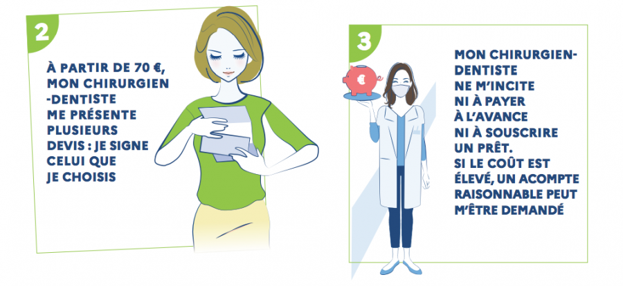 Conçue en lien avec l’Ordre des des chirurgiens-dentistes et les ARS, elle rappelle de manière simple au grand public les règles élémentaires que les libéraux comme les centres dentaires se doivent de respecter lors de la prise en charge : informations claires sur les soins et les traitements proposés ou les alternatives possibles avec un temps de réflexion nécessaire à la prise de décision ; présentation d’un devis et de ses alternatives à partir de 70 € ; liberté totale de choix ; présentation des documents de traçabilité des prothèses ou implants et enfin possibilité de solliciter, sur demande écrite, la copie de son dossier médical mis à disposition « sous 8 jours ou dans les 2 mois pour les dossiers de plus de 5 ans ».