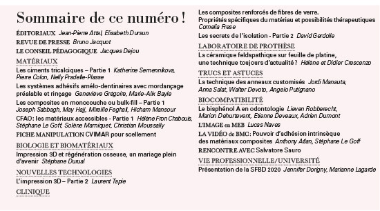 Jean-Pierre Attal : Tout d’abord, laissez-moi remercier les 1 000 abonnés qui nous ont déjà fait confiance. C’est un nombre très encourageant, après seulement six mois d’existence ! Cela prouve que BMC répond à un réel besoin chez les praticiens et chez les étudiants. Le numéro 2 est particulièrement riche avec plus de 110 pages, soit une quinzaine d’articles. Vous y trouverez nos rubriques désormais habituelles (Bibliomatériaux, Matériaux, La vidéo de BMC, Le conseil pédagogique, La fiche manipulation de matériau, Impression 3D…) ainsi que 3 nouvelles rubriques.