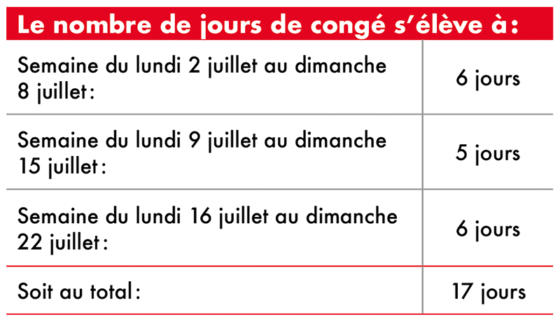 Ainsi, si un salarié travaillant cinq jours par semaine, du lundi au vendredi, souhaite prendre trois semaines de congé début juillet 2018 (du lundi 2 juillet au dimanche 22 juillet). Le samedi étant le premier jour de congé, il ne sera pas décompté. D’autre part, la période de congé payé englobant un jour férié, tombant le samedi 14 juillet, cette journée ne sera pas décomptée. Au total, le salarié aura bénéficié de 17 jours de congé sur les 30 acquis.