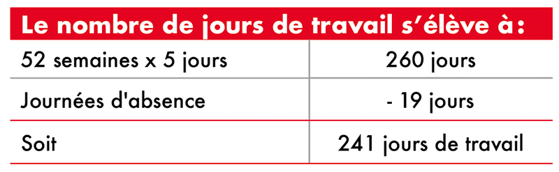 La durée des congés est égale à 2,5 jours par mois de travail effectif accompli au cours de l’année de référence. Si le nombre de jours ouvrables ainsi calculés n’est pas un entier, il est arrondi au nombre supérieur. Sont ainsi assimilés à un mois de travail effectif les périodes équivalentes à 4 semaines ou 24 jours de travail. Cette équivalence peut être abaissée à 22 jours lorsque l’horaire est réparti sur 5,5 jours (5,5 x 4 sem.), 20 jours lorsque l’horaire est réparti sur cinq jours (5 x 4) et 16 jours lorsque l’horaire est réparti sur quatre jours (4 x 4).