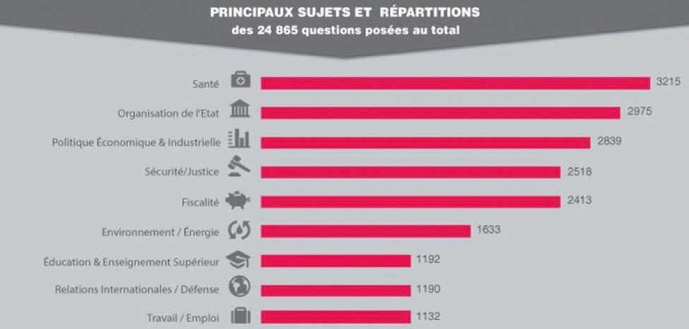 Les questions sur la santé (3215, près de 13 % du total) sont les plus nombreuses, suivies de celles sur l’organisation de l’État (2 975) devant la politique économique et industrielle (2 839), la Sécurité et la justice (2 518). À l’inverse, les thèmes internationaux, européens ou de défense ne constituent que 4,7 % du total des questions tout comme le travail et l’emploi (1 190 questions), pourtant premier sujet de préoccupation des Français que représentent les députés… Parmi les questions de santé, on trouve d’abord des questions d’ordre général (près de 1 000 items sur le médicament, la politique de santé, la gestation pour autrui, l’accès aux soins…) devant les questions plus spécifiques sur les professions de santé (près de 700, notamment autour des sages-femmes dont le statut a été très discuté) puis les handicapés (environ 470).