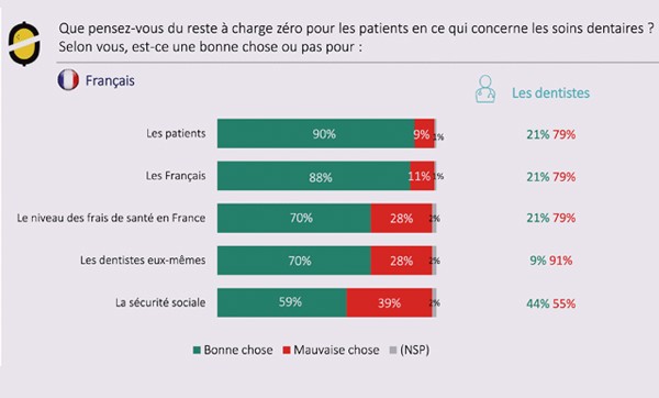 Réalisé par Internet auprès de 996 Français représentatifs ainsi que 697 professionnels (dont 591 libéraux et seulement 66 chirurgiens-dentistes), le Baromètre santé 360 montre que si les Français aiment leurs dentistes, comme les autres professionnels de santé d’ailleurs (91 % des sondés ont une bonne opinion de ceux qui les soignent : médecins, pharmaciens, sages-femmes, kinés…), ils ne les comprennent pas toujours. Le reste à charge zéro en dentaire ? Les sondés en sont certains, c’est une bonne chose pour les patients (90 %), pour le niveau des frais de santé (70 %), pour la Sécurité sociale (59 %) et… pour les chirurgiens-dentistes eux-mêmes (70 %) ! Évidemment, les praticiens interrogés pensent tout l’inverse. C’est une catastrophe, pour eux (91 %), pour les patients (79 %), mais aussi pour la Sécurité sociale (55 %).