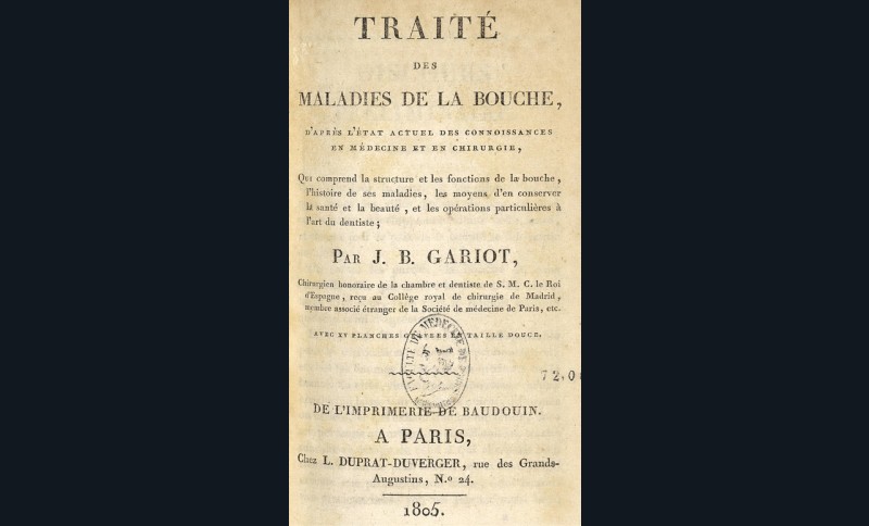 Jean-Baptiste Gariot est né à Sainte-Menehould en 1761, l’année de la mort de Fauchard. Au commencement de son exercice, il pratique probablement dans plusieurs villes de France ; des affiches de Rennes témoignent de son passage dans cette ville en tant qu’expert dentiste reçu à Poitiers.