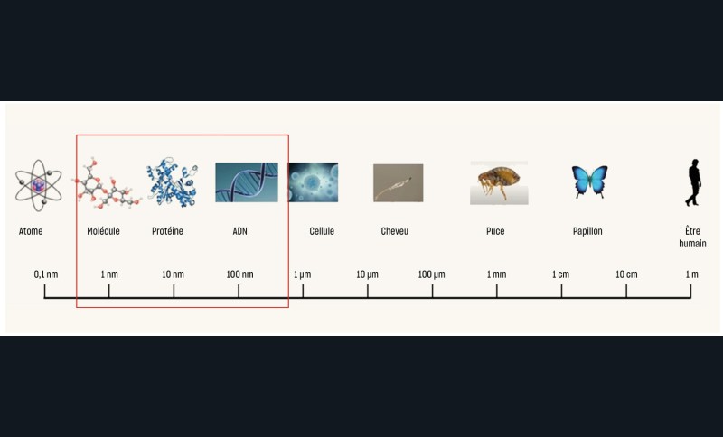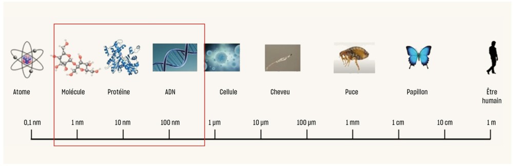 Dans le monde des nanoparticules (NP), certaines sont d’origine naturelle, émanant notamment des volcans ou des embruns marins. D’autres sont produites de manière non intentionnelle par les activités humaines via les rejets des véhicules à moteurs thermiques comme les particules ultrafines. Enfin, d’autres sont manufacturées. Et lorsque au moins une de leurs dimensions est inférieure à 100 nanomètres, soit une taille située entre celle de l’atome et celle des virus, on parle de nanomatériaux (fig. 1). À proprement parler, une NP a ses trois dimensions inférieures à 100 nanomètres. Le terme « nanos » permet de désigner au sens large des NP ou des NM.