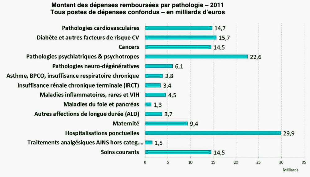 Au 1er rang figurent les pathologies et facteurs de risques cardiovasculaires qui représentent plus de 30 milliards de dépenses et concernent 11,5 millions d’assurés. Deux pathologies forment plus de la moitié de ces dépenses : la maladie coronaire aiguë (infarctus du myocarde) ou chronique (4,4 milliards) et l’accident vasculaire cérébral (3,7 milliards). Mais les traitements des facteurs de risques cardiovasculaires (diabète, hypertension artérielle, hyperlipidémie) ne sont pas en reste avec 15,7 milliards remboursés : diabète, 7,5 milliards ; hypertension artérielle, 5,6 milliards ; hyperlipidémie, 2,6 milliards. Avec 22,6 milliards de dépenses, la santé mentale (hospitalisation, prise en charge en ALD et, surtout, consommation d’anxiolytiques, hypnotiques et neuroleptiques) mobilise également des ressources importantes.