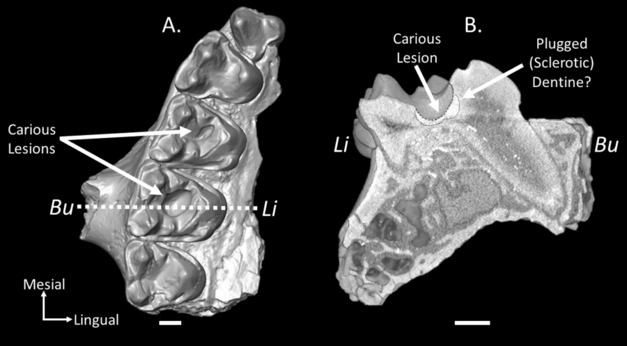 « Toutes les caries identifiées dans notre échantillon sont des caries occlusales primaires localisées dans le bassin occlusal, détaillent les auteurs. Les lésions carieuses n’ont été identifiées que sur les dents postcanines, bien que cela puisse être dû au fait que la dentition antérieure est moins fréquemment retrouvée dans les archives fossiles ». Cette prévalence de caries est élevée mais pas rare pour des primates y compris de nos jours.