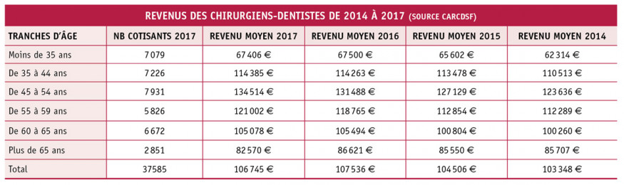 Selon les statistiques de la caisse de retraite (CARCDSF) portant sur 37 585 revenus déclarés (ODF et autres spécialités compris), le revenu moyen 2017 avant impôts (IRPP) s’élevait à 106 745 € (bénéfice fiscal avant déduction des cotisations assurance groupe et Madelin, Dom-Tom inclus), marquant une baisse de 0,74 % par rapport à 2016 (évaluation au 11 janvier 2019).
