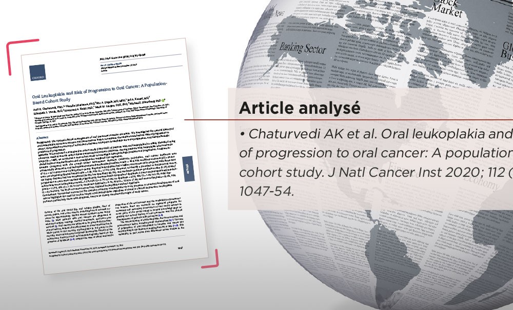 Les cancers de la cavité buccale représentent la localisation la plus fréquente des cancers des voies aéro-digestives supérieures avec une incidence mondiale de 250 000 cas par an. Ces cancers sont à 90 % des carcinomes épidermoïdes qui se développent le plus souvent de novo. Mais parfois, ce cancer peut résulter de lésions à risque de transformation maligne.