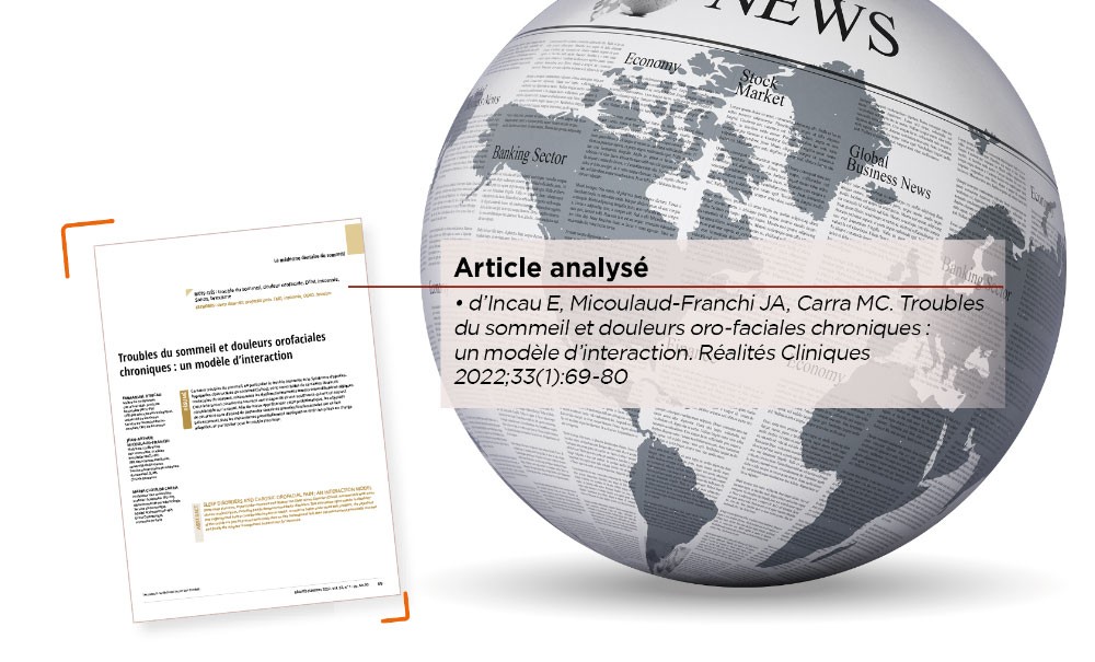 En effet, à la lecture de cet article récent, nous pouvons noter que certains troubles du sommeil, en particulier le trouble insomnie et le syndrome d’apnées-hypopnées obstructives du sommeil (SAHOS), sont comorbides ou cooccurrents de certaines douleurs oro-faciales chroniques, notamment les dysfonctionnements temporo-mandibulaires algiques (myalgie et/ou arthralgie). Cette interaction occasionne souvent une incapacité et une souffrance qui ont un impact considérable sur la santé.