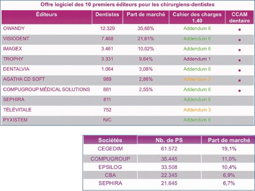 Seulement quatre éditeurs de logiciels se partagent près de 80 % du marché des cabinets dentaires : Owandy, Visiodent, Imagex et Trophy (voir tableau ci-contre), selon le « Panorama des éditeurs pour les professionnels de santé libéraux » publié par le GIE Sésam-Vitale, le 27 janvier.
