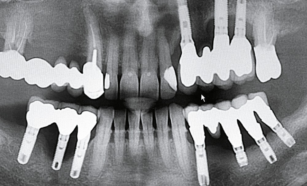 Je recherche des signes cliniques tels que la suppuration, facile à objectiver par simple pression digitale. Je sonde peu car la forme des implants, les profils concaves des piliers, les bombés proximaux rendent cet examen difficile et, finalement, assez peu fiable. Je réalise une radiographie panoramique annuelle associée à des rétro-alvéolaires dès qu’une image est insuffisante ou me paraît suspecte.