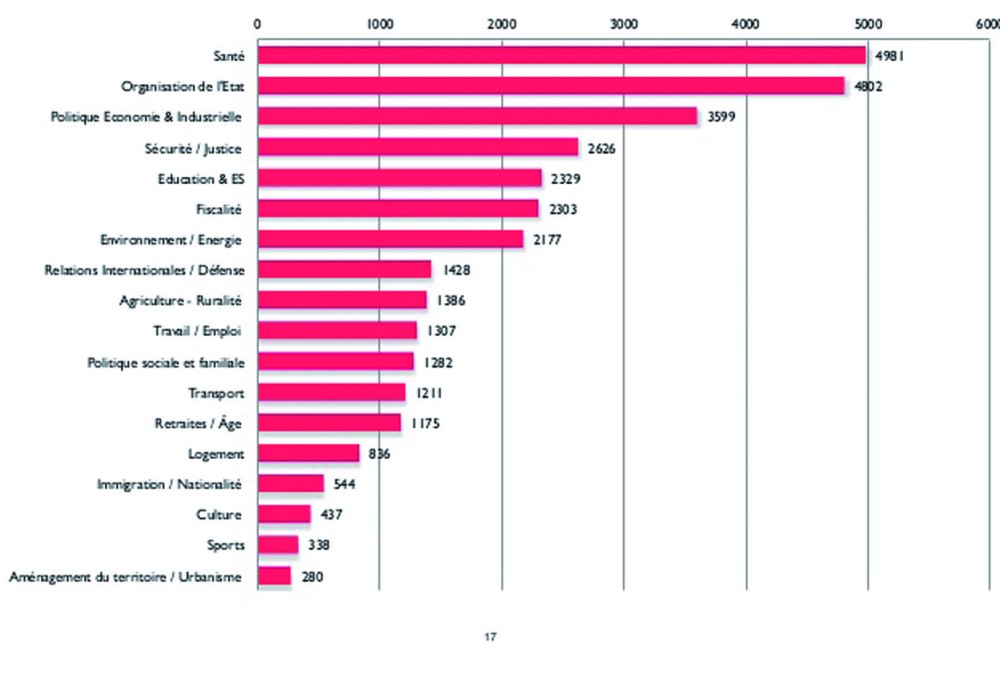 Les questions sur la santé (4 981, près de 15 % du total) sont le plus souvent posées, suivies de celles sur l’organisation de l’État (4 802) et la politique économique et industrielle (3 599). Les thèmes internationaux, européens ou de défense ne constituent que 4,6 % du total des questions. Parmi les questions de santé on trouve d’abord des questions d’ordre général (près de 1 400 items sur le médicament, la politique de santé, l’accès aux soins…) devant les questions plus spécifiques sur les professions de santé (près de 1000) puis les handicapés (environ 900). Les députés peuvent librement déposer des questions écrites à la Présidence de l’Assemblée nationale qui les notifie au gouvernement.