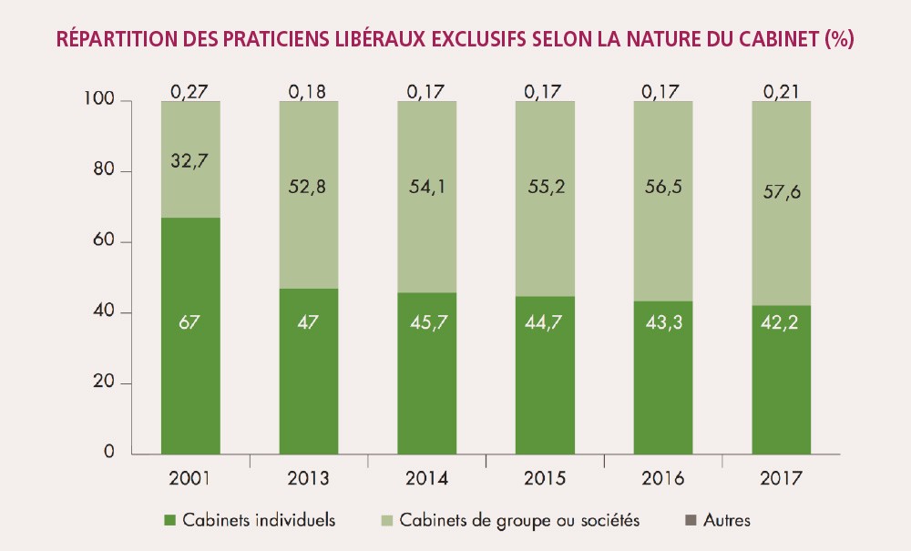 Et le phénomène devrait perdurer, la part des praticiens exerçant en groupement ou en société ne cessant de gagner du terrain. Depuis 2014, cette part progresse en moyenne de 2,3 % par an. En 2017, 35 % des cabinets sont des sociétés ou des groupements. Ce type d’exercice facilite la mutualisation des coûts de fonctionnement et d’équipements. Surtout, il autorise un recours accru au salariat, permettant une redistribution des tâches dans laquelle le praticien peut privilégier son temps de soins au fauteuil, seule valeur ajoutée du cabinet. En 2017 toujours, la profession compte 30 536 cabinets dentaires (contre 36 100 en 2012), soit 2 122 habitants par cabinet pour l’ensemble du territoire métropolitain. Mais leur répartition géographique est très inégale. Si, par exemple, on compte 1 598 habitants par cabinet en région Provence-Alpes-Côte d’Azur avec une large majorité de structures individuelles, la Normandie affiche 2 889 habitants par cabinet, essentiellement constitués en société.