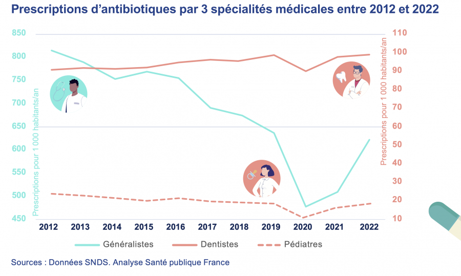 « Leurs prescriptions ont progressé depuis 2012 (+ 0,6 % par an en moyenne) et, malgré la baisse observée en 2020, elles étaient en 2022 à un niveau légèrement supérieur à celui atteint en 2019 », souligne SPF.