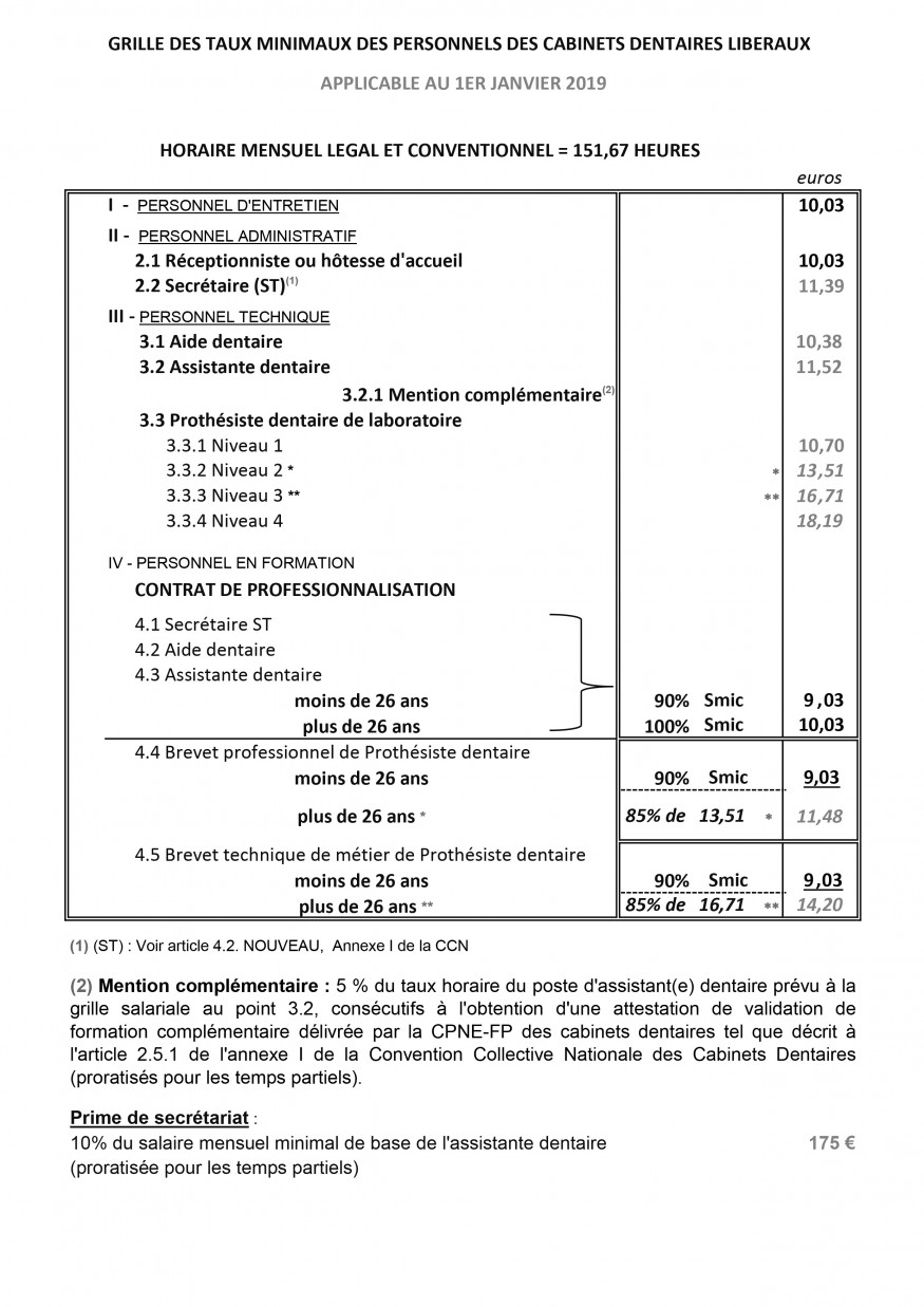 Après un accord entre les trois organisations patronales (FSDL, CNSD et UJCD) et les syndicats de salariés, Fnispad, majoritaire dans les cabinets dentaires, FO et UNSA, les taux horaires minimaux des personnels qualifiés (emplois d’aide, d’assistante, de secrétaire technique dentaire) ont été réévalués de 1,9 %.