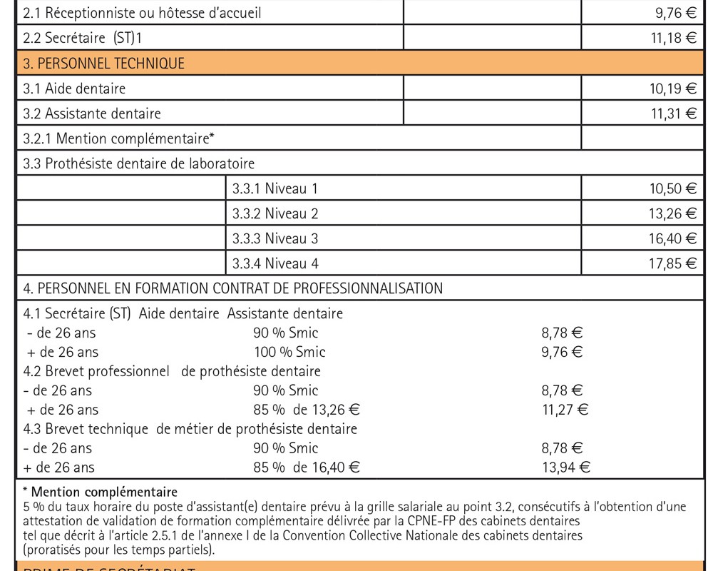 Après un accord salarial conclu entre les trois organisations patronales (FSDL, CNSD et UJCD) et les syndicats de salariés, Fnispad, majoritaire dans les cabinets dentaires, FO et CFDT, les taux horaires minimaux des personnels qualifiés (emplois d’aide, d’assistante, de secrétaire technique et de prothésiste dentaire) ont été réévalués de 1,6 %.
