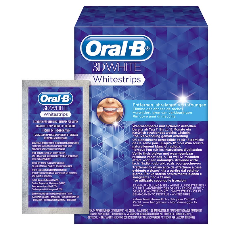 Les Oral-B 3D White® Whitestrips sont de fines bandes flexibles de polyéthylène recouvertes de 5,25 % de peroxyde d’hydrogène. Elles s’adaptent aux dents et maintiennent le gel blanchissant en contact avec leur surface suffisamment longtemps pour permettre une élimination des taches. L’objectif annoncé par le fabricant : faire disparaître les taches avec des premiers résultats visibles en une semaine et se prolongeant jusqu’à douze mois. Ce traitement esthétique ne dure que 14 jours. Les 3D White® Whitestrips étant uniquement disponibles dans les cabinets dentaires, la première application est expliquée par le chirurgien-dentiste, le patient effectuant ensuite les autres applications à domicile.