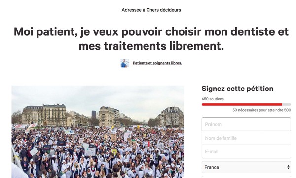 L’argumentaire de cette pétition, intitulée « Moi patient, je veux pouvoir choisir mon dentiste et mes traitements librement », explique aux patients les enjeux actuels et le risque de basculer vers une dentisterie de production de masse, à faible coût et de qualité médiocre.