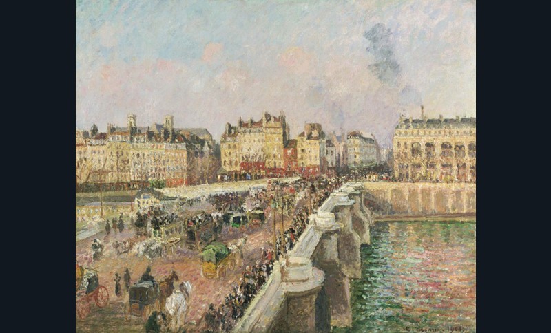 « C’est moderne en plein ! » Monet vient de se lancer dans les vues portuaires. Pissarro s’y essaie aussi, de son côté, à Rouen, à Dieppe ou au Havre, peignant par série les sujets de fierté des cités et ceux qui n’en sont pas : la ville qu’on ne regarde pas, celle des chantiers portuaires, de l’activité industrielle, les lumières du progrès et ses fumées. C’est un coup de maître, et le succès tant attendu. Peindre ce qu’il voit de sa fenêtre va devenir une habitude. D’abord depuis celle des hôtels, où il guette les rapides variations du ciel normand, puis, lorsque les hivers le ramènent à Paris et que ses yeux malades lui imposent l’abri d’une vitre, celle de son étage Place Dauphine ou d’autres points élevés sur le Louvre, l’Opéra, la Seine… Il peint la capitale recréée par Haussmann quand d’autres la fuient, et ses vues plongeantes emballent le public qui y sent quelque chose de neuf. Il écrit à son fils Lucien en 1897 : « Je suis enchanté de faire ces rues de Paris que l’on a l’habitude de dire laides, mais qui sont si argentées, si lumineuses et si vivantes… C’est moderne en plein ! » Voilà Pissarro peintre de la modernité urbaine, mais d’une modernité mouvante, chatoyante et brassée, très différente de ce que retenait dans ses perspectives urbaines son ami Caillebotte au tracé d’architecte et à la poétique du vide si personnelle. Tendu vers le mouvement, Pissarro prend la tension de la ville à même ses artères neuves où circule la foule. Caillebotte enregistre, en retrait dans le salon feutré, le calme pouls de sportsman des beaux quartiers où toute agitation est déplacée. Deux visions de la cité, de la société, opposant l’anarchiste et le bourgeois ? Tentant mais injuste : Caillebotte, refusé au Salon de 1875 pour « sujet vulgaire », n’avait nul mépris de l’ouvrier.