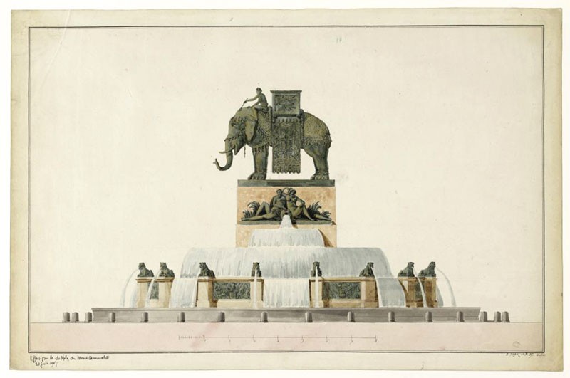 Preuve qu’ils eussent pu s’entendre, l’Empereur reconnaîtra que « Le Mariage de Figaro, c’est déjà la Révolution en action ». Et l’action, il connaît.En 1800, après le coup d’État, le Premier Consul voit très loin et va très vite. Paris à ses yeux ne doit pas être seulement la capitale de la France, mais celle de l’Europe, de l’Empire Français. Pour moderniser une ville, il faut une volonté, un plan, des talents, des moyens. L’homme pressé ordonne, l’intendance suit. Pourquoi perdre du temps puisque, depuis 1794, le Plan des Artistes a déjà tracé les grandes lignes, dont l’axe Est-Ouest qui relie la Place du Trône-Renversé (Nation) au Louvre, tel ledecumanusdes villes romaines ? L’attaque en 1801 porte sur deux fronts : les Tuileries, où il s’installe, et… la Bastille ! Pas besoin de lui faire un dessin : faire de la Bastille une place, c’est la reprendre à lui seul, avec toute sa charge symbolique. Au point qu’il persiste à y vouloir ériger l’Arc de Triomphe, projet qu’on aura bien du mal à lui faire oublier. A trois ans près, Beaumarchais eût savouré ce triomphe, dont l’apoplexie l’a privé. A la place de l’Arc, Bonaparte veut un éléphant-fontaine. Plusieurs dessins sont réalisés et une maquette géante est installée sur site, en attendant. Il aime les percées et les fontaines, et choisit les architectes Percier et Fontaine. Pour le style, ce sera beau comme l’antique ; c’est la mode et le petit César en a goûté la grandeur en Italie et en Égypte. Absolutiste qui construit sa légende, il voit en Paris son théâtre. Urbaniste, il entend joindre le beau à l’utile. Administrateur né, il privilégie les «édifices d’utilité » : abattoirs, marchés, quais, ponts (ceux d’Austerlitz, de la Cité et des Arts) et fontaines.