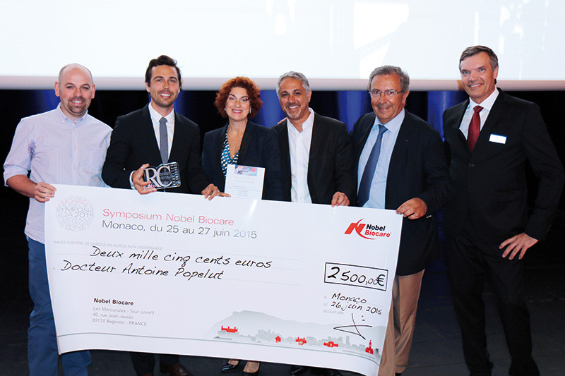 De gauche à droite, le docteur Jérémie Perrin et le docteur Antoine Popelut, respectivement 3e et 1er prix, Madame Claudie Damour-Terrasson, présidente du groupe Espace id, le docteur Marwan Daas, coordinateur scientifique Réalités Cliniques, le professeur Patrick Missika, membre du jury et Monsieur Christian Rocton, président de Nobel Biocare France.
