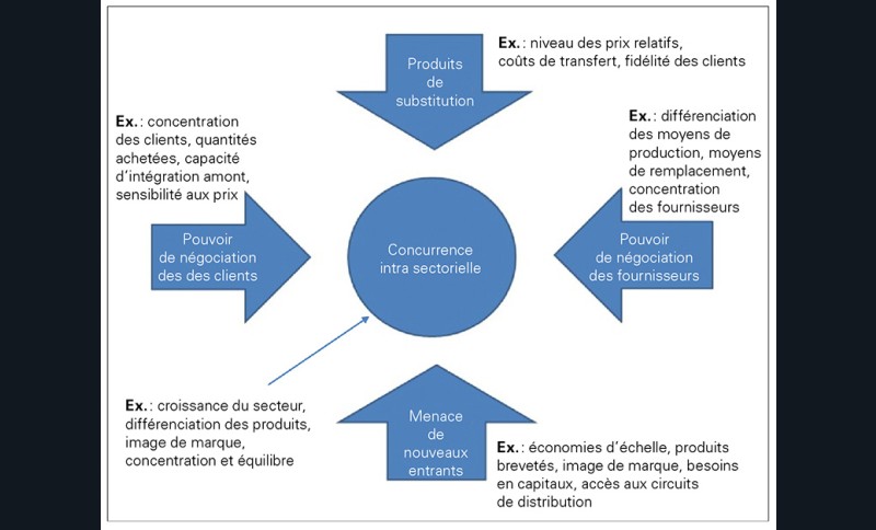 Parmi les nombreux outils analytiques, citons celui de Michael E. Porter, célèbre professeur en stratégie à Harvard et consultant en entreprise. La figure 1 schématise les cinq forces en présence dans un secteur donné.