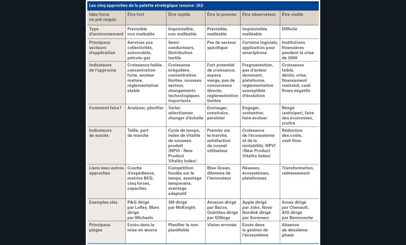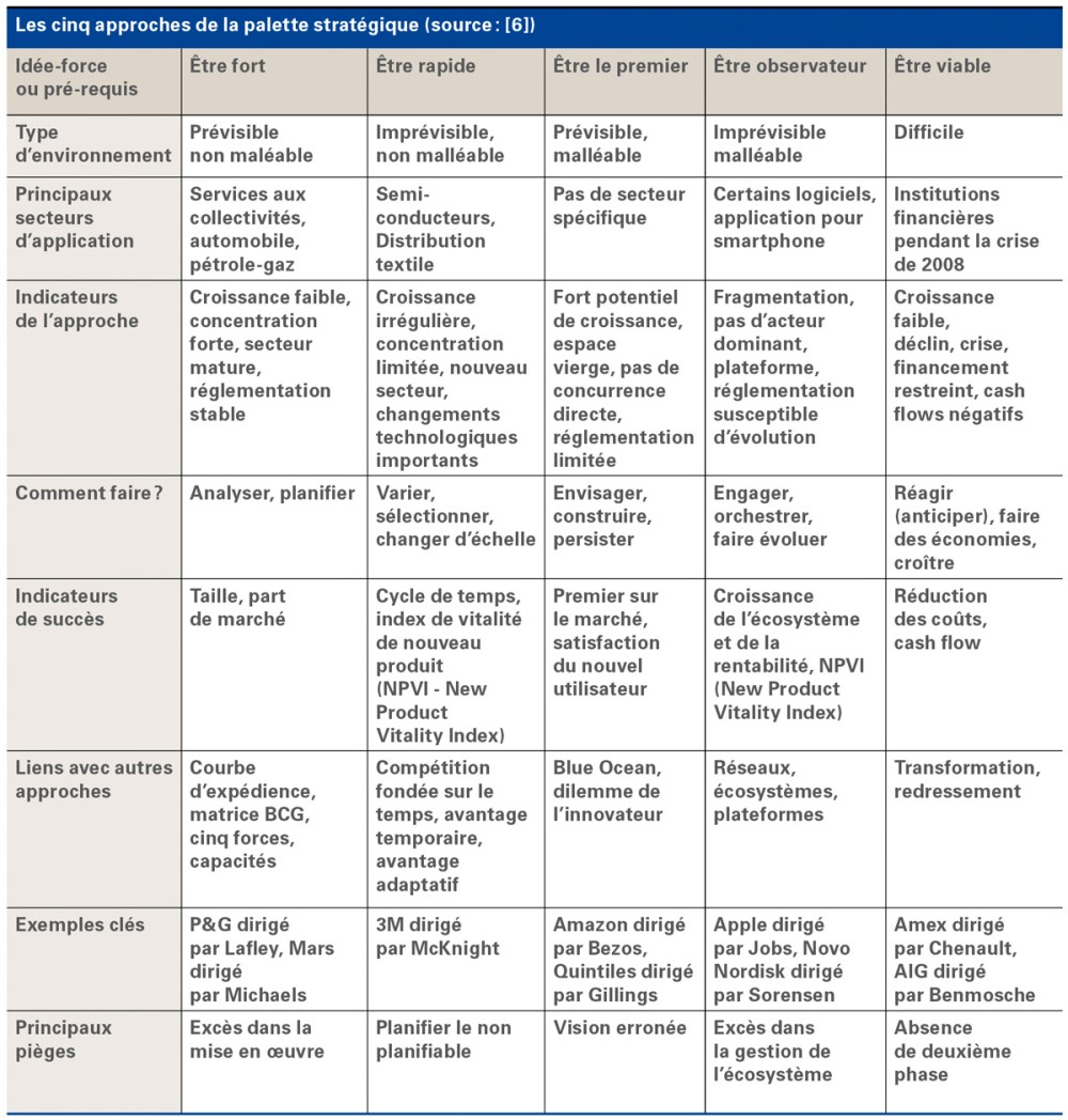 Aussi, le tableau ci-dessous synthétise les principales approches stratégiques et nous donne des éléments pour nous guider en fonction de l’orientation choisie. On constatera que toutes les orientations sont possibles en fonction des choix, des environnements, des moyens, des évolutions et des capacités d’adaptation. Le tableau invite à s’interroger sur la cohérence des éléments clés entre eux et avec notre projection.