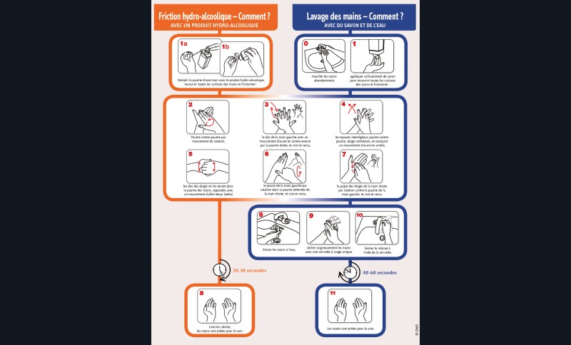 Les auteurs de cet article ont évalué l’efficacité du lavage de mains pratiqué par des soignants par une observation directe de la conformité des six étapes de friction recommandées par l’OMS : paume contre paume, paume main droite sur dos main gauche et vice-versa, paume sur paume avec entrelacement des doigts, dos des doigts contre la paume opposée, friction du pouce et enfin friction du bout des doigts (étapes 2 à 7 du tutoriel de l’OMS en illustration). L’évaluation fut réalisée sur une période de 5 mois dans différents services d’un hôpital du Qatar par une équipe d’infirmières spécialement formées à ce recueil de données effectué sans interférence avec les soins et sans que le personnel soignant observé en soit informé. Furent considérés le type de lavage (au savon ou par friction à la solution hydro-alcoolique (SHA)) et la catégorie de soignant (infirmières, médecins ou auxiliaires de soins). Sur 12 497 lavages observés, 63 % ont été effectués par friction à la SHA.