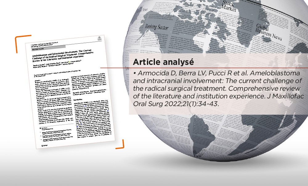 L’améloblastome est une tumeur odontogénique d’origine épithéliale, bénigne mais agressive avec une forte tendance à la récidive. Se développant essentiellement au sein de la mandibule, l’améloblastome peut atteindre une taille très importante aux dépens de l’invasion des structures loco-régionales. L’extension intracrânienne (base du crâne, sinus, fosses infratemporale et ptérygopalatine, espace parapharyngée et orbites) est rare mais gravissime, car elle engage le pronostic vital. Il n’existe pas à l’heure actuelle de consensus de prise en charge pour les patients concernés.