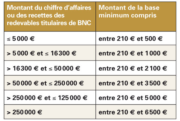 Pour les impositions dues au titre de 2014, en l’état actuel des textes et compte tenu de la revalorisation prévue, le plancher de la base minimum devrait s’établir à 210 € et les plafonds à 2 101 €, 4 084 € et 6 209 € selon le cas.
