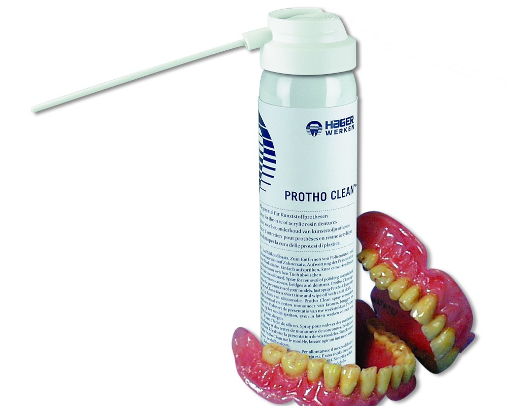 Protho Clean® est un produit nettoyant et lustrant synthétique pour l’entretien des prothèses. Ce spray, au parfum de menthe, permet une présentation plus esthétique et hygiénique des travaux prothétiques. Il permet aussi d’éliminer les restes de pâte à polir et de monomères des prothèses.