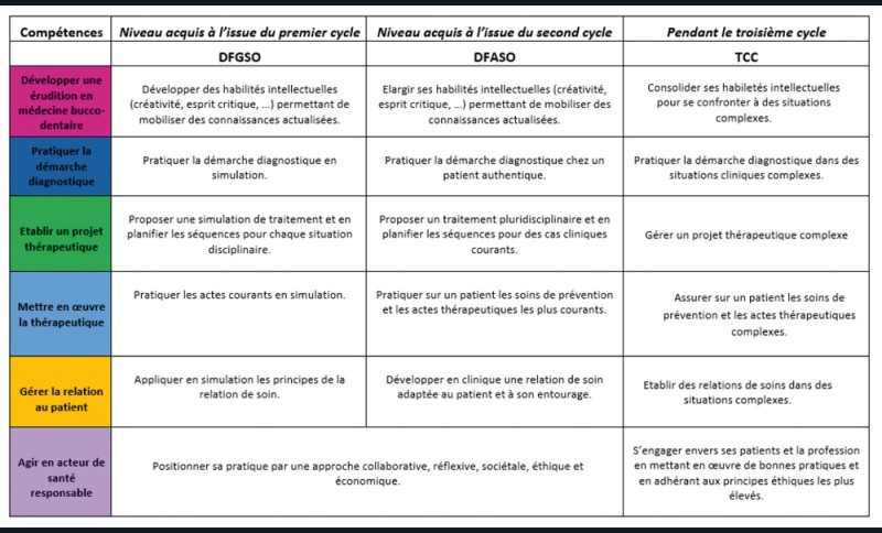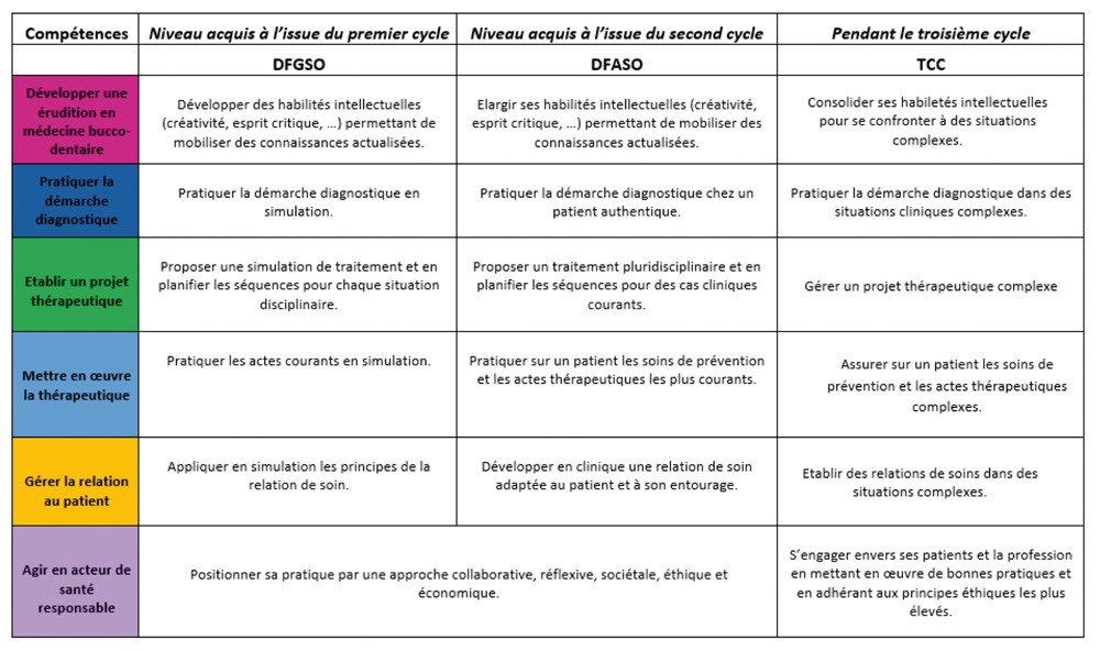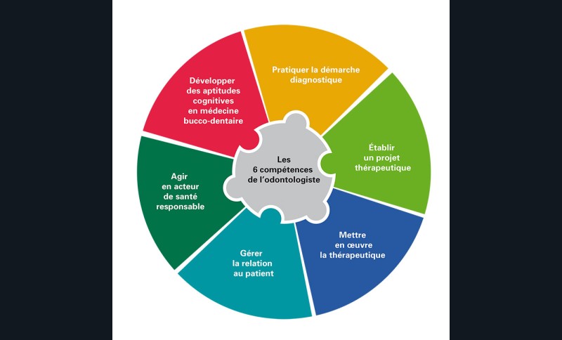 Tout au long du parcours de formation initiale en odontologie, les enseignements et activités d’apprentissage permettront aux futurs praticiens le développement des compétences professionnelles illustrées dans la figure 1.