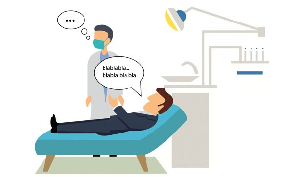 Vingt-trois secondes : c’est en moyenne le temps de parole du patient avant que le médecin ne l’interrompe pour diriger l’entretien*. Les plannings des cabinets dentaires sont souvent surchargés. Le chirurgien-dentiste doit non seulement honorer ses rendez-vous programmés, mais aussi les urgences ; il est souvent débordé et manque de temps. Aussi, lorsqu’un patient se présente au cabinet pour évoquer son mal-être sans aucun lien avec son état bucco-dentaire, c’est autant de temps en moins pour soigner ceux qui en ont le plus besoin. Pour autant, le chirurgien-dentiste a un rôle social, un devoir d’écoute, notamment auprès des patients esseulés, ceux qui souffrent et trouvent en leur praticien une confiance et une écoute attentive, bienveillante et humaine, car l’attitude du chirurgien-dentiste vis-à-vis de son patient a un impact sur sa santé. * Anne Revah-Levy, Laurence Verneuil. Docteur, écoutez ! Pour soigner, il faut écouter. Ed Albin Michel : mars 2016.