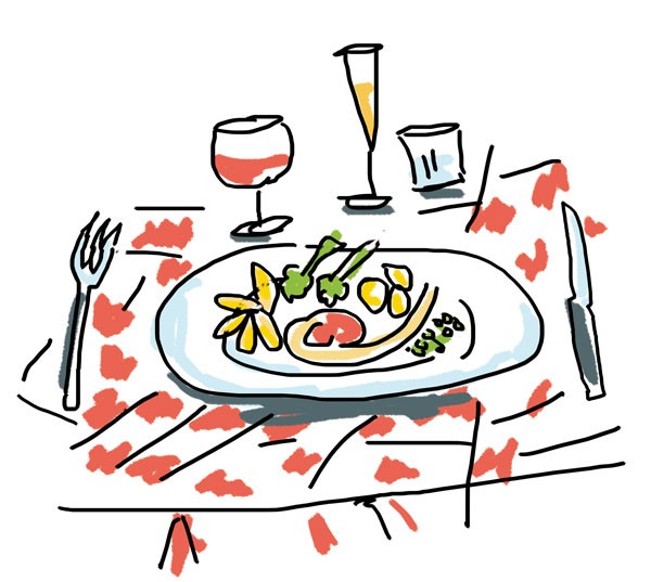 Plats : ravioles de ricotta à la sauge et jambon de Parme, rougets avec ses aubergines et son coulis de poivrons, suprême de volaille rôti dans son jus, girolles et fèves sautées, crème brûlée à la verveine.