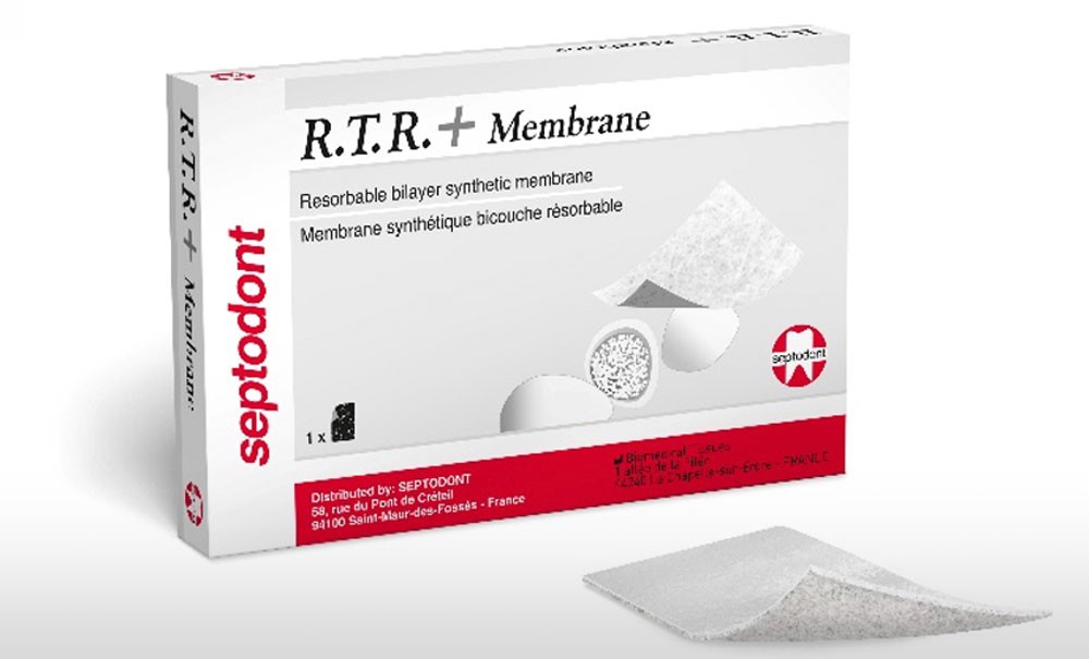De par leur fonction de création d’une barrière physique entre le défaut osseux et les cellules épithéliaux-conjonctives, les membranes sont devenues un incontournable en chirurgie. R.T.R+ Membrane est un prototype synthétique bicouche résorbable (PLGA) pour la régénération tissulaire guidée. Le PLGA est l’association de PLA (acide polyactique) et de PGA (acide polyglycolique), qui sont des copolymères biodégradables et biocompatibles issus de l’amidon de tapioca, de maïs ou de canne à sucre. On a donc l’assurance de prévenir tout risque de transmission pathogène d’origine animale et de ne pas heurter les convictions culturelles ou religieuses des patients, tout en obtenant une résorption complète en six mois.