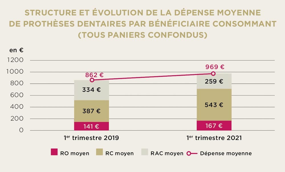 Celle-ci porte sur les données du premier semestre 2021, comparées au premier semestre 2019, les résultats de l’année 2020 étant trompeurs compte tenu de la crise sanitaire. Sur cette période, les remboursements des OCAM (Organismes complémentaires d’assurance maladie) augmentent de 60 % pour le dentaire (de 1,241 à 1,988 Md€) quand la dépense totale croît de 28 % (passant de 2,765 à 3,549 Md€).