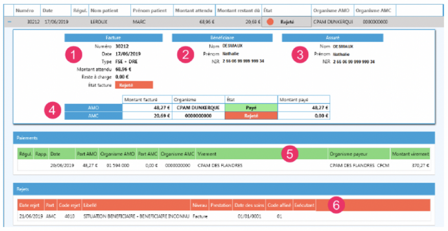 4 > Le détail des montants, organismes payeurs, état et montants réglés pour les parts AMO et AMC.