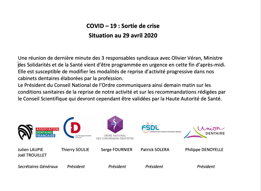 Les recommandations de l’Ordre pour la reprise d’activité des cabinets dentaires seront finalement communiquées demain matin, annoncent les représentants de la profession : Ordre, ADF et les trois syndicats FSDL, Les CDF et Union Dentaire (lire ci-dessus). Elles étaient attendues aujourd’hui.