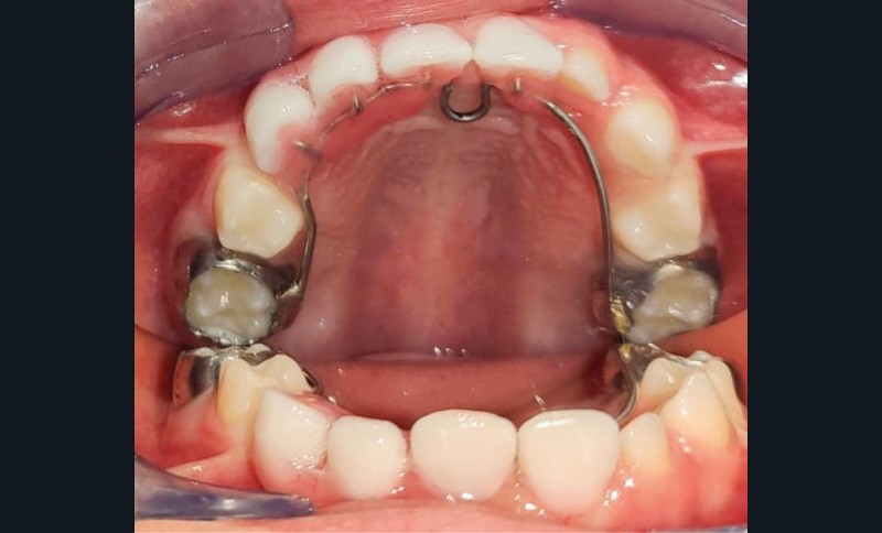 Pour les édentements limités, les dents prothétiques peuvent être fixées sur un arc palatin ou lingual, lui-même fixé sur des bagues orthodontiques ou des coiffes pédiatriques préformées (CPP) sur les secondes molaires temporaires. Ce type de mainteneurs d’espace fixe exige une hygiène buccale rigoureuse, un mauvais contrôle de plaque entraînant un risque de caries des dents porteuses des bagues ou de CPP.